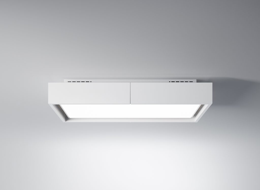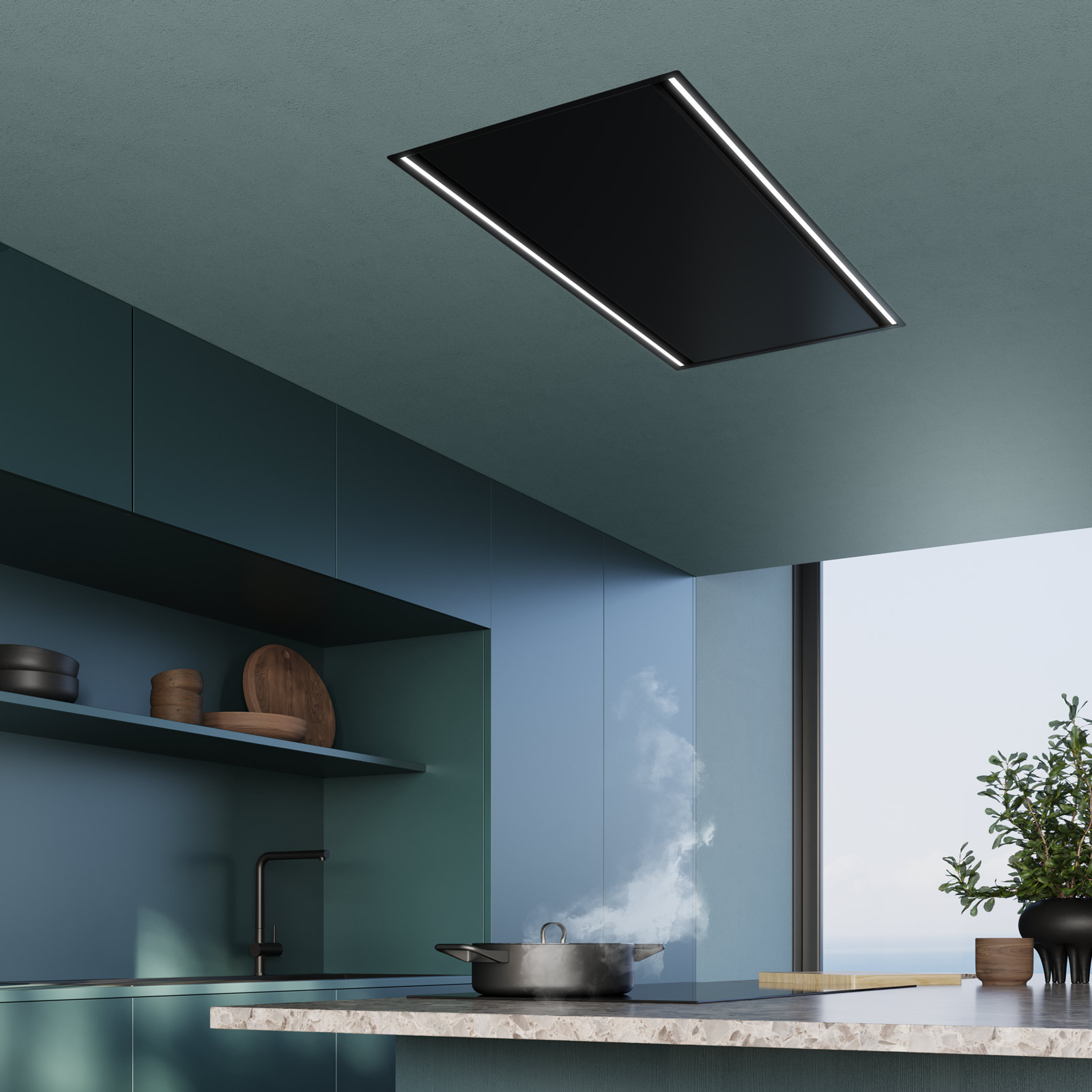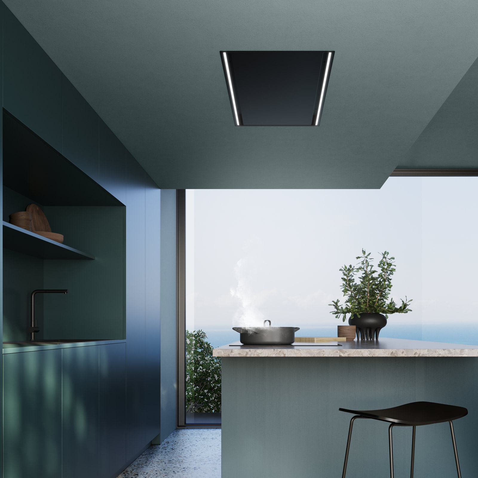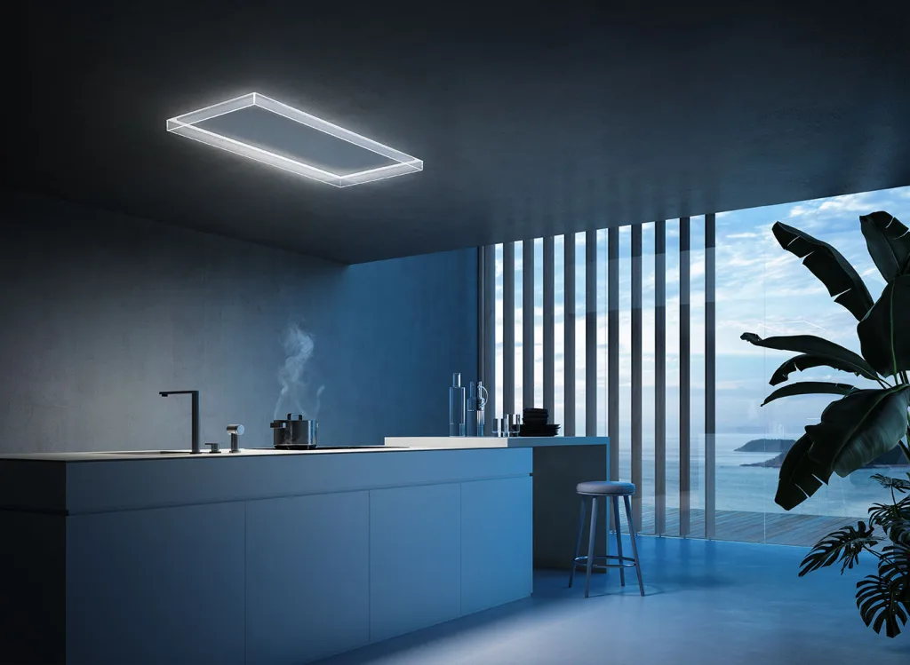 Designet til Mirage kjennetegnes av en raffinert og tidløs estetikk som forener form og funksjon. Ventilatoren integreres sømløst i kjøkkenet, nesten usynlig, og skaper en lys og behagelig atmosfære takket være to slanke LED-striper med dynamisk og dimbart lys, tilpasset interiøret.
