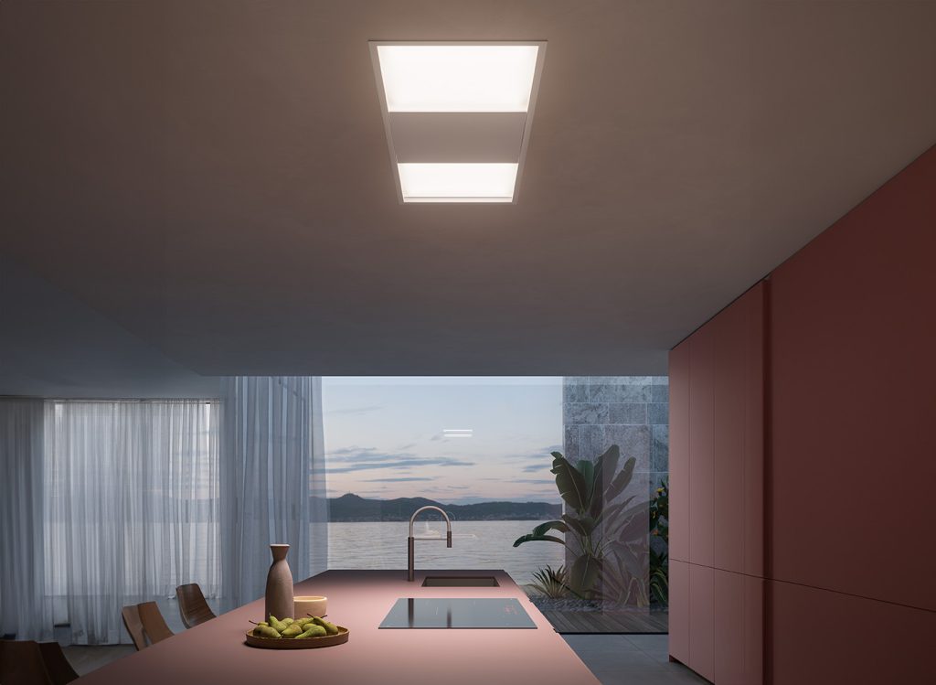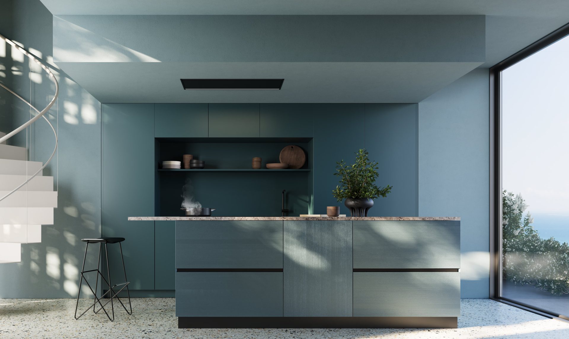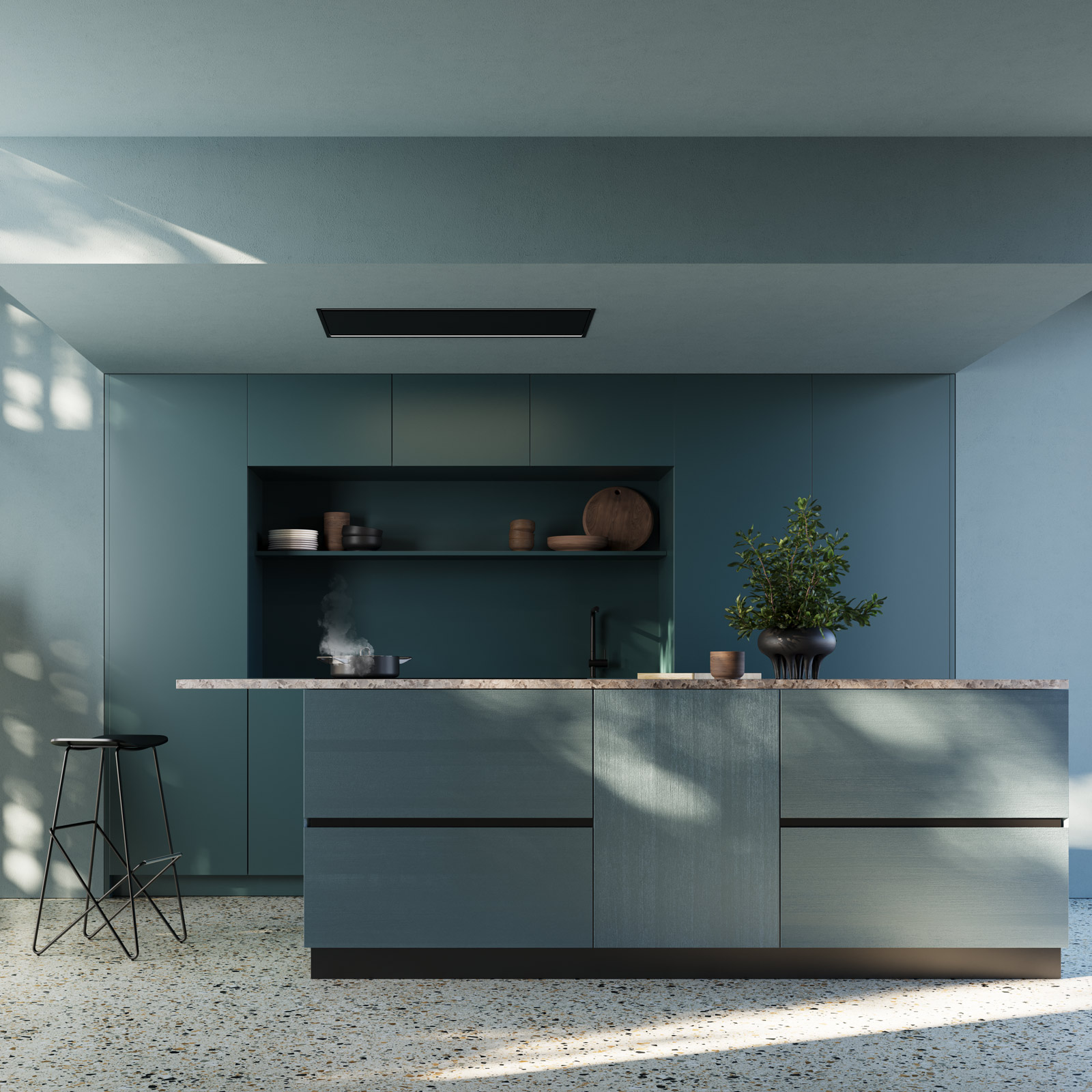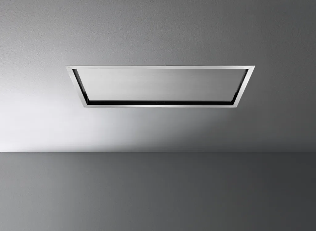 Designet til Mirage kjennetegnes av en raffinert og tidløs estetikk som forener form og funksjon. Ventilatoren integreres sømløst i kjøkkenet, nesten usynlig, og skaper en lys og behagelig atmosfære takket være to slanke LED-striper med dynamisk og dimbart lys, tilpasset interiøret.