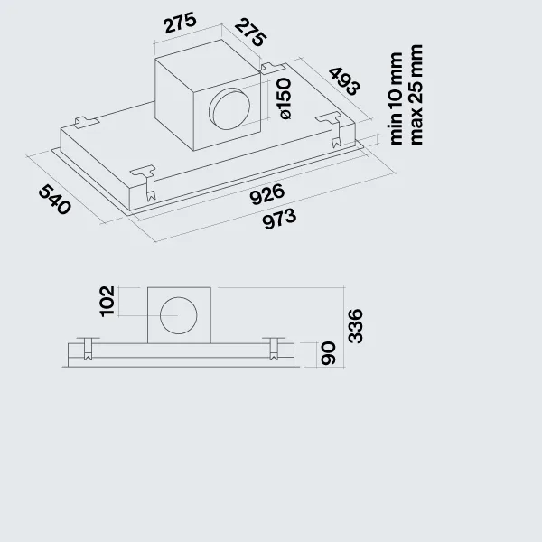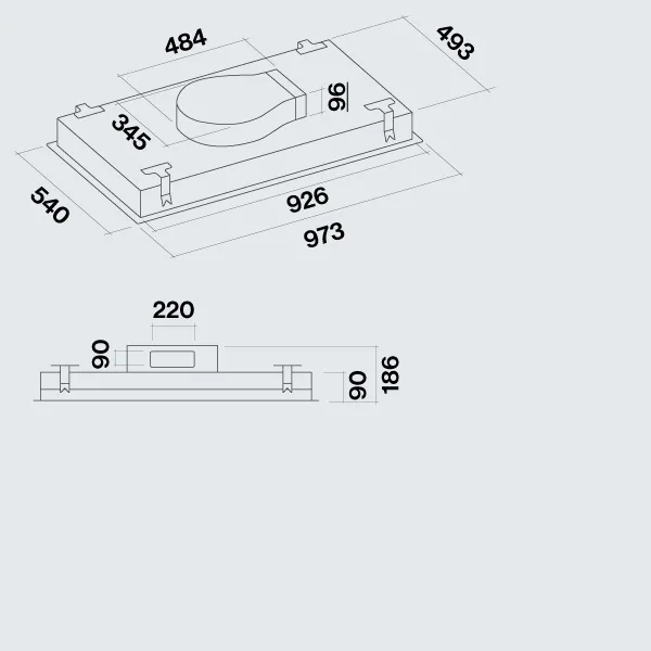 – Mål ventilator: B: 973mm, D: 540mm H: 90mm